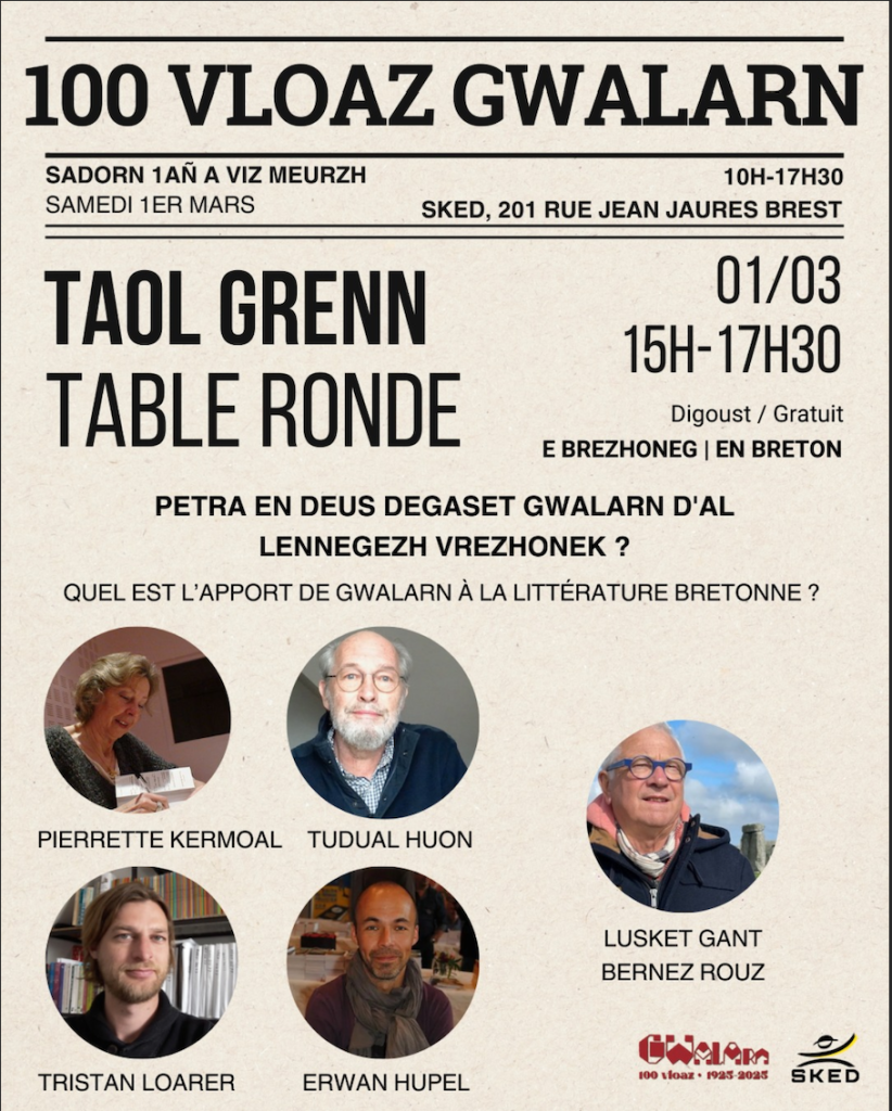 ♦ HUPEL Erwan et al. (2025), « Taol grenn — Petra en deus degaset Gwalarn d’al lennegezh vrezhonek ? [Table ronde — Qu’est-ce que Gwalarn a apporté à la littérature en langue bretonne ?] », conférence organisée par l’association Sked, Brest, le 1er mars 2025.