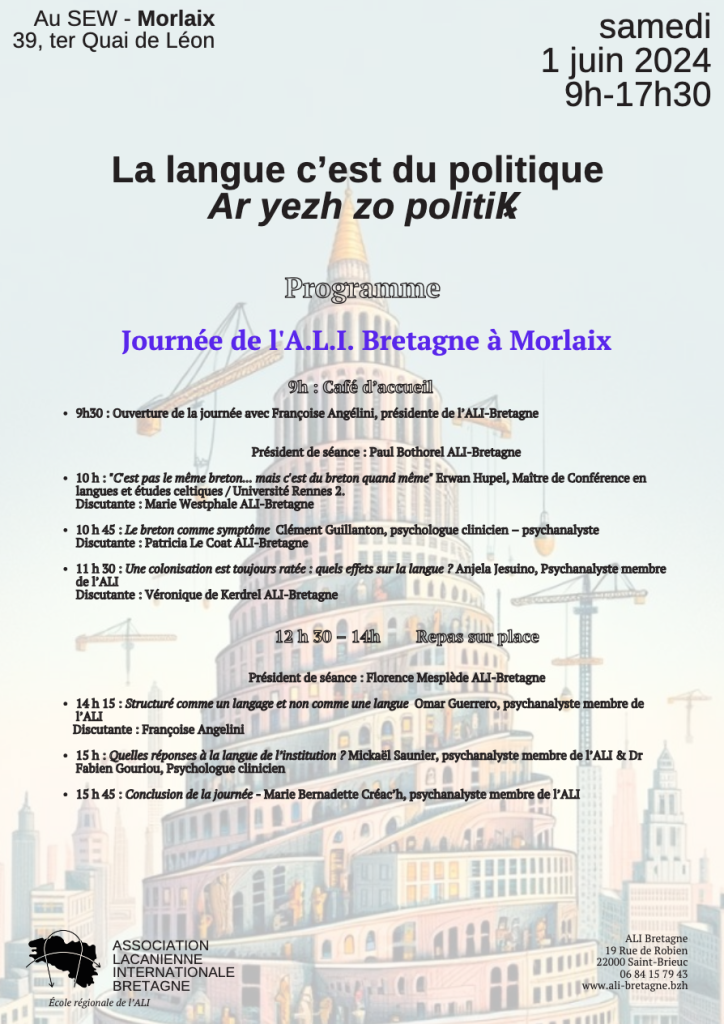 ♦ HUPEL Erwan (2024), « C’est pas le même breton… mais c’est du breton quand même ! », Journée de l’Association Lacanienne Internationale de Bretagne, Morlaix, le 1er juin 2024. Thème de la journée « La langue c’est du politique », actes parus sous la direction de Clément Guillanton, La langue c'est du politique, Kerali -- revue de l'association lacanienne internationale de Bretagne, n° 8, 2025, pp. 15-27.